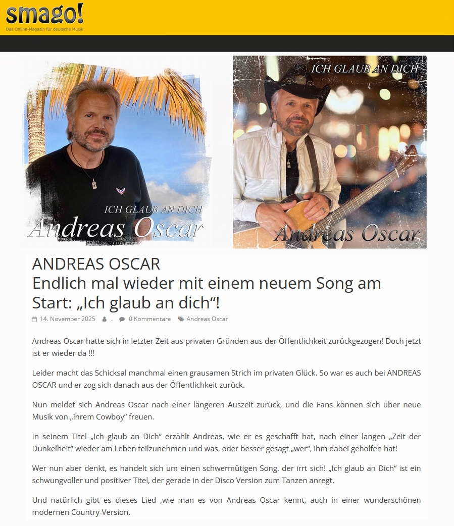 Interpret, Songwriter, Mensch Sieger der 1. Country-Music-Trophy (Kategorie: Solo-Künstler) Bekannt durch: * 3sat * Gute Laune TV * Deutsches Musik Fernsehen * VolksmusikTV * CenterTV * NUNA.tv * WDR4 * MDR1 * SR3 * SWR4 * HR4 * BRF2 * Radio Paloma * BR1 * NDR1 * RBB * ORF Kompositionen für bzw. mit: Mara Kayser, Melanie Payer, Christin Stark, Ingrid Anderson, Erwin aus Tirol, Mariella, ... NEW - 11/2025 Ich glaub an dich - ANDREAS OSCAR ![]() www.schlagerprofis.de/