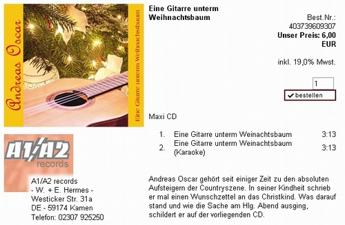 http://www.a1-a2-records.de/ Die Single "Ein Haus ist ein Daheim nur mit dir" von Andreas Oscar, ist hier erhältlich!!! ![]() http://www.a1-a2-records.de/ Hier bei diesem AMAZON-Händler sind die dort angebotenen CDs auf Lager, sofort bestellbar und werden auch sofort geliefert! Die Single "Eine Gitarre unterm Weihnachtsbaum" von Andreas Oscar, ist hier erhältlich!!! ![]() http://www.a1-a2-records.de/ Die Single, "Die Zeit mit Dir" von Andreas Oscar, ist hier erhältlich!!! ![]() http://www.a1-a2-records.de/ Die Single, "Sie trägt meinen Namen" von Andreas Oscar, ist hier erhältlich!!! ![]() http://www.a1-a2-records.de/ Das CD-Album "Der Engel bleibst Du"