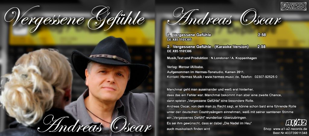 ![]() ANDREAS OSCAR - "Vergessene Gefühle" Macnhmal geht man auseinander und weiß erst hinterher, daß es ein Fehler war. Manchmal bekommt man aber eine zweite Chance, dann spielen "Vergessene Gefühle" eine besondere Rolle Andreas Oscar weiß mit seiner samtenen Stimme ein "Vergessenes Gefühl" wunderbar rüberzubringen. "Ein wunderbar romantischer und tanzbarer Song" ![]() Single ist bei "a1-a2-records" bestellbar: A1/A2 records - W. + E. Hermes - Westicker Str. 31a DE - 59174 Kamen Telefon: 02307 925250 Telefax: 02307 9252533 E-Mail : info@hermes-music.de www.a1-a2-records.de Hier bei diesem AMAZON-Händler sind die dort angebotenen CDs auf Lager, sofort bestellbar und werden auch sofort geliefert! ANDREAS OSCAR - "Die Nadel im Heu" Wer Liebe sucht, will die Eine oder den Einen unter Millionen auch finden. Andreas Oscar erging es nicht anders. Der Countrysänger, der in Sachsen geboren wurde, weiß, wie schwierig die Suche ist. Er suchte auch einmal - wie so viele - "Die Nadel im Heu". Die Melodie geht ins Ohr, der Rhythmus in die Beine und der Text lädt zum träumen ein. Ein Song für die Tanzfläche, fürs Radio, für Schlagerfreunde und Countryfans zugleich. Eine Produktion mit Klaus Pelizaeus und Charly Schade im Hermes-Tonstudio Kamen 2010 * www.hermes-music.de Videoclip-Fotocam-Mitschnitt => http://www.youtube.com/watch?v=9T77QfjqStI Single bei "a1-a2-records" bestellbar: A1/A2 records - W. + E. Hermes - Westicker Str. 31a DE - 59174 Kamen Telefon: 02307 925250 Telefax: 02307 9252533 E-Mail : info@hermes-music.de ![]() www.a1-a2-records.de Sampler/Compilations COUNTRYHITS VOL. 4 Dieser Sampler entstand in Zusammenarbeit mit Deutschlands größter Fachzeitschrift für Country Music WESTERN MAIL ![]() http://www.amazon.de/Countryhits-Vol-4-Various/dp/B0052GPIJ0 (* auch bei www.da-music.de erhältlich *) DANCING AT THE PARTY JOLINA CARL & GITTY [3.13] ON THAT TRAIN TEXAS HEAT [3.56] THAT'S WHAT YOU DO DANIYELLA [3.18] I PLAY COUNTRY MUSIC FOLEY,BARRY P. [3.16] HELLO I'IM JOHNNY CASH TRUCK STOP [2.18] HONKY TONK HEARTS LAMMERS MEYER,HERMANN [2.03] COUNTRY AUF GUT DEUTSCH CARL,JOLINA [3.15] ME ON THE RADIO HILLBILLY DELUX [3.03] IF YOU LISTEN TO YOUR HEART GITTY [4.16] KUMPEL WIE DU HODGKINS,JOE [3.08] HONKY TONK OF LIFE RASCAL & MCLANE [2.54] YOU AIN'T NOTHING BUT FINE ANNIE ZYDECO & SWAMP CATS [2.36] ER SAGT "NO" OSCAR,ANDREAS [3.01] SHE STILL DANCES ALONE MOUNTARILLO [4.02] MAY AND THE EAGLE NEW VERSION MACKAY,JACKSON [3.41] ONE OF THESE DAYS SILVER,STAN [3.09] DU BIST DA CHRISTIANE & REINER [3.01] COWGIRLS EYE,HENRY [2.59] LADY GLANDT,ANDY [4.09] FOUR MARKS FIFTY JOE HODGKINS BOSS BAND [3.44] ANDREAS OSCAR - Er sagt "No" Wo sind die Männer, die noch zu ihrem Wort stehen? Welche Bedeutung hat das Wort TREUE für die, die einen Ring tragen? Hier haben wir zumindest ein Vorzeige-Objekt aus der Countryszene. Andreas Oscar, der zuletzt mit "Engel, Teufel, Lady und Sphinx" eine Hommage an seine Liebste präsentierte, zeigt sich allen Verlockungen gegenüber standhaft - Er sagt "No". Eine Produktion mit Klaus Pelizaeus und Charly Schade im Hermes-Tonstudio Kamen 2010 * www.hermes-music.de Videoclip-Fotocam-Livemitschnitt => http://youtu.be/Sy3yEkfaSQU Single bei "a1-a2-records" bestellbar: ![]() www.a1-a2-records.de Hier bei diesem AMAZON-Händler sind die dort angebotenen CDs auf Lager, sofort bestellbar und werden auch sofort geliefert! Die CD zur Radio Show ist da! Schlager Rallye Superhitparade 2010 - Die Top 20 * ab dem 15.Oktober überall im Handel erhältlich